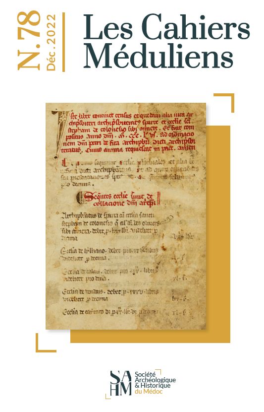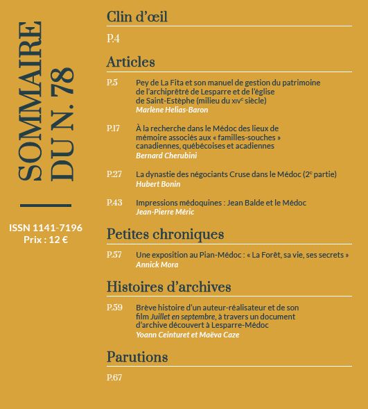 A découvrir, un document du XIVe siècle sur Lesparre, conservé en mains privées mais qui a pu être numérisé et étudié par l’IRHT (Institut de la recherche et d’histoires des textes) ; mais aussi un film tourné dans les années 1980 à Lesparre ! A ne pas manquer, la suite de l’histoire de la famille Cruse en Médoc et des recherches menées, et à mener, sur les familles-souches canadiennes, québécoises et acadiennes en Médoc. Enfin, Jean-Pierre Méric rend hommage à l’écrivaine Jean Balde et partage avec nous quelques beaux passages écrits sur le Médoc.