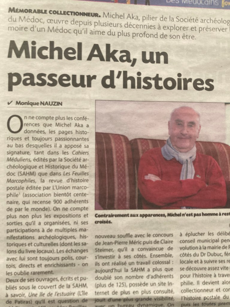 [PRESSE] « Michel Aka, un passeur d’histoires ». Merci à Monique Nauzin pour son bel article sur notre secrétaire de la SAHM et l’un des plus fidèles contributeurs des Cahiers Méduliens. À lire dans le Journal du Médoc du vendredi 30 décembre 2022.